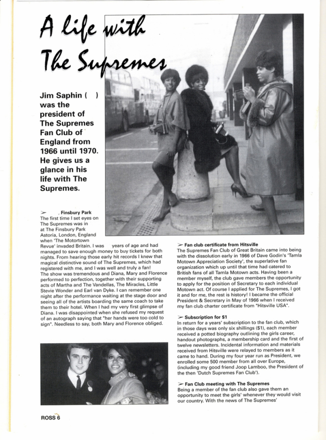 As Motown’s ‘flagship’ pop group, The Supremes were riding high on a wave of Top Ten hits with songs like ‘Where Did Our Love Go,’ ‘Stop In The Name Of Love,’ ‘Come See About Me,’ and ‘You Keep Me Hangin’ On,’ British fan Jim Saphin started their very first off-shore fan club.